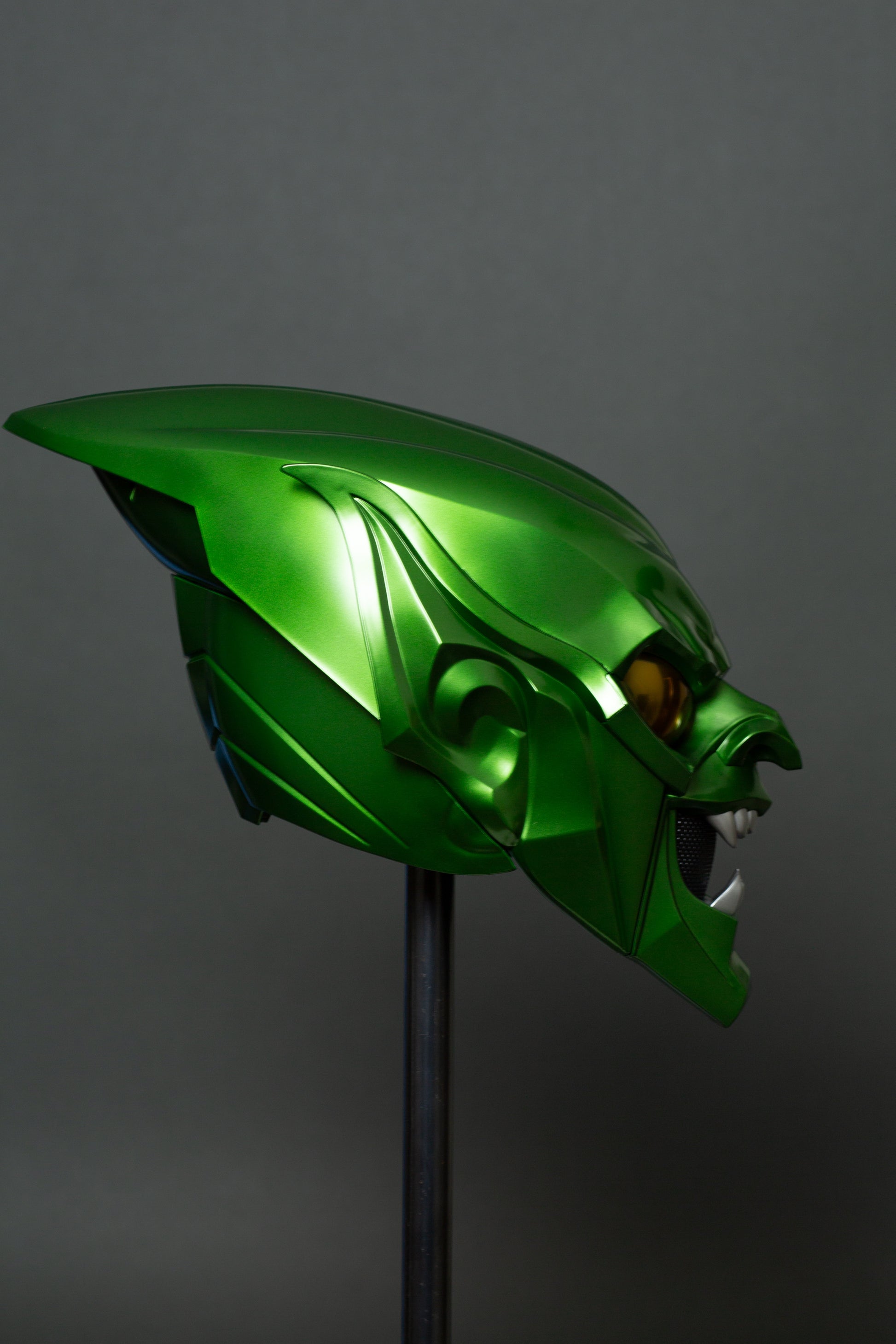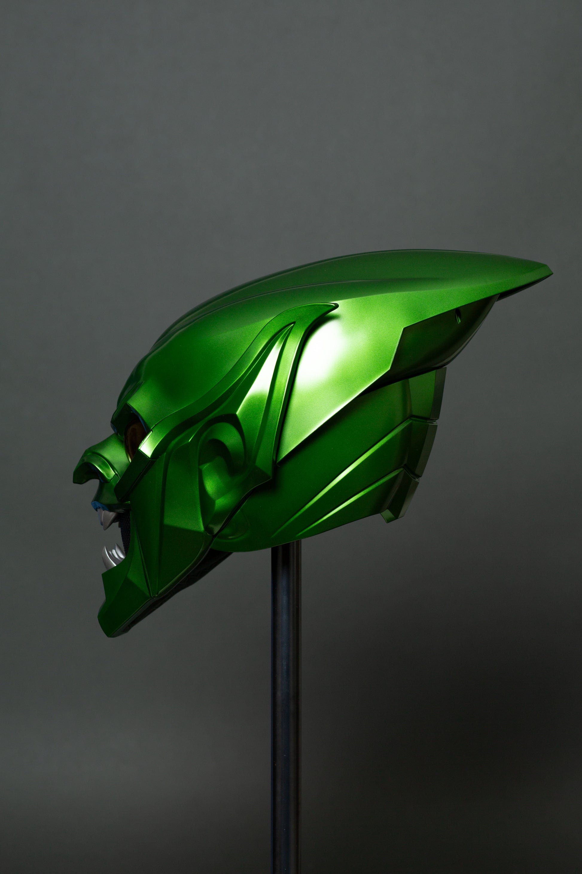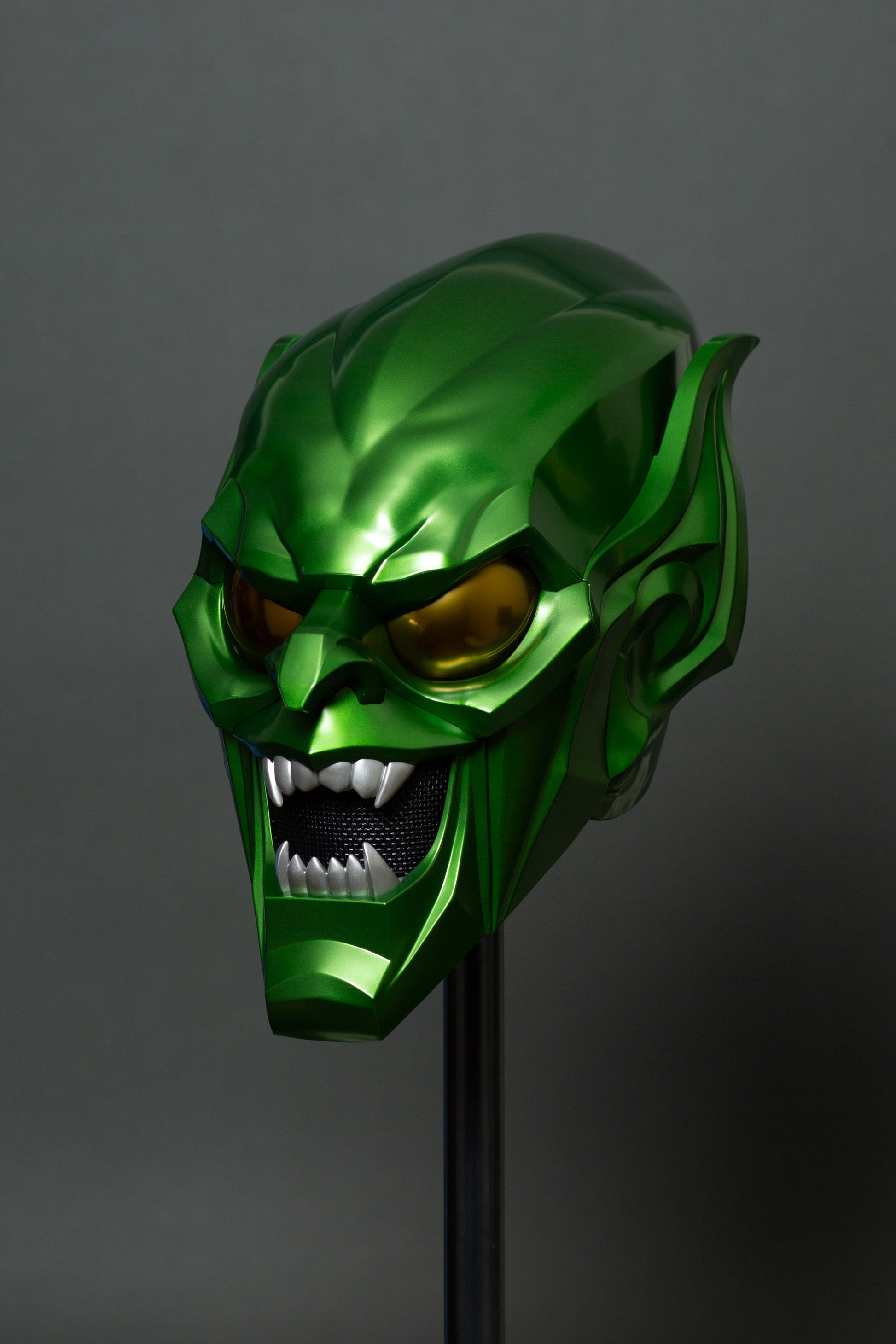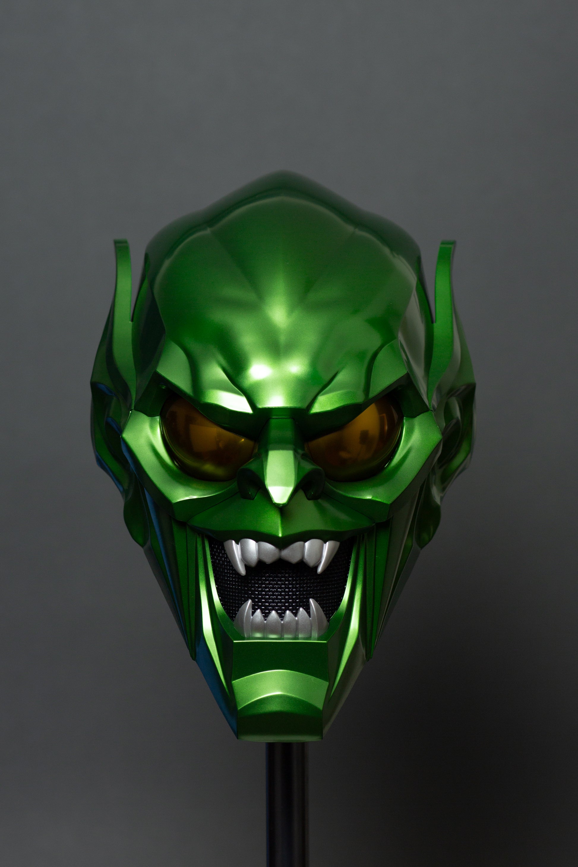 The Green Goblin Helmet is a replica designed to reflect the classic enemy's look from the Spider Man universe. It features a metallic green finish, sculpted lines, and sharp contouring around the face.