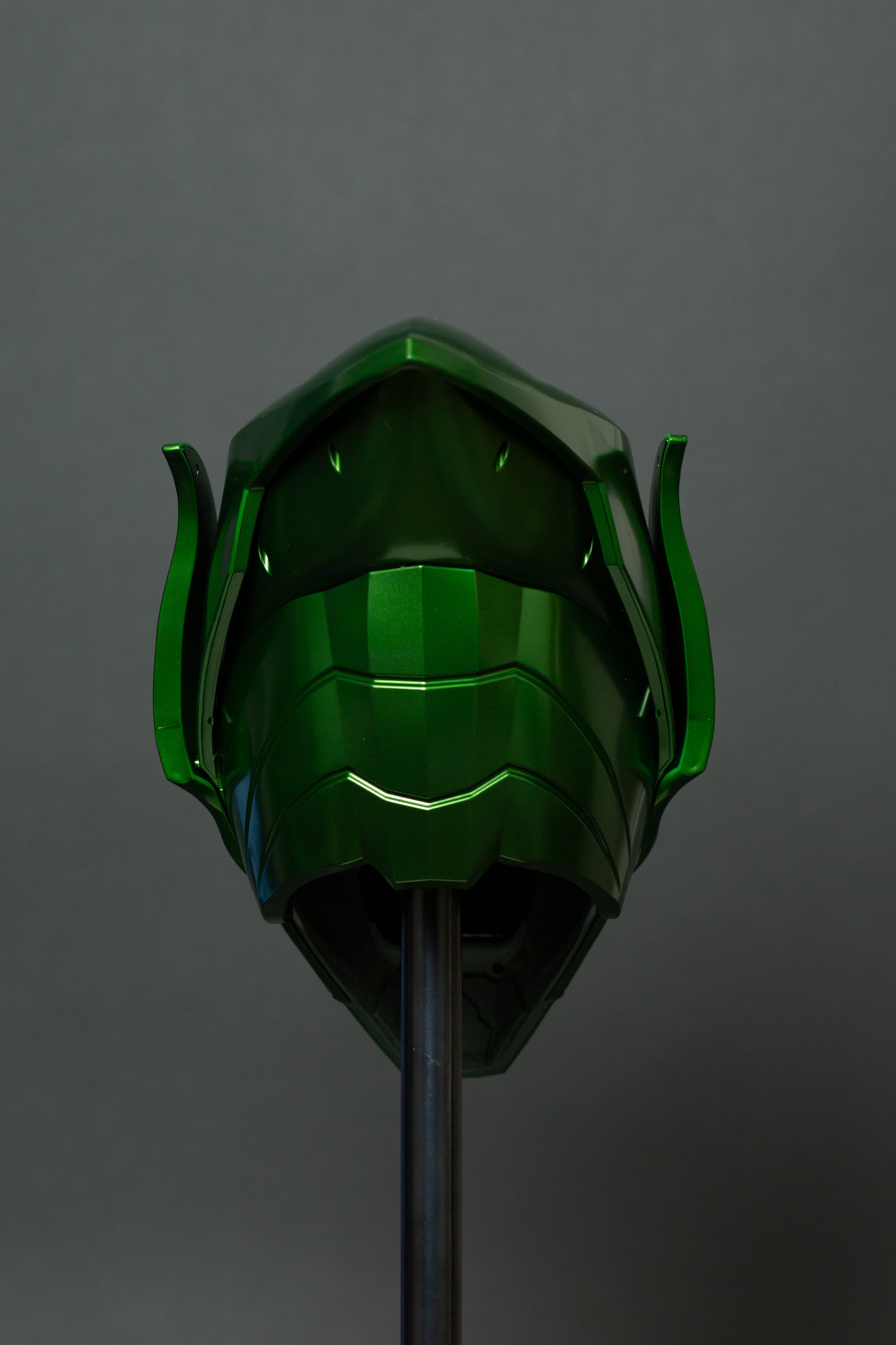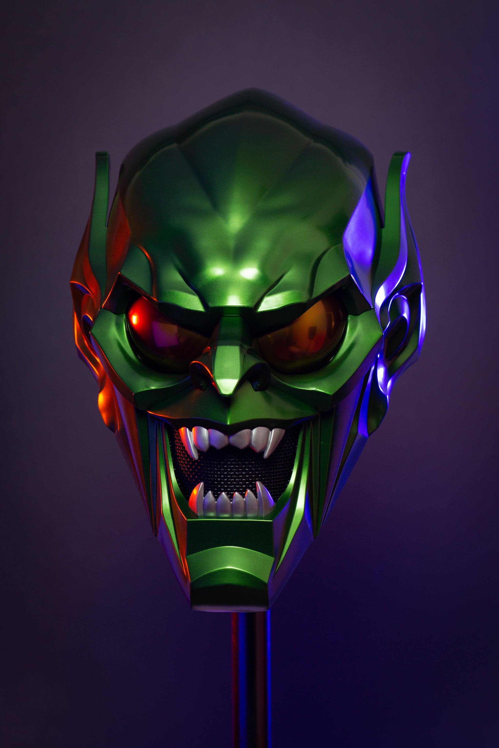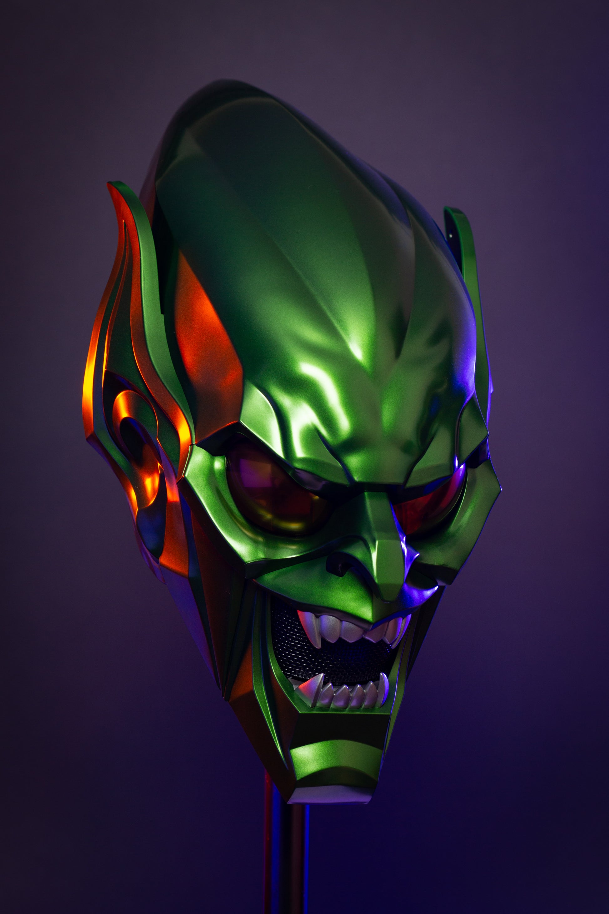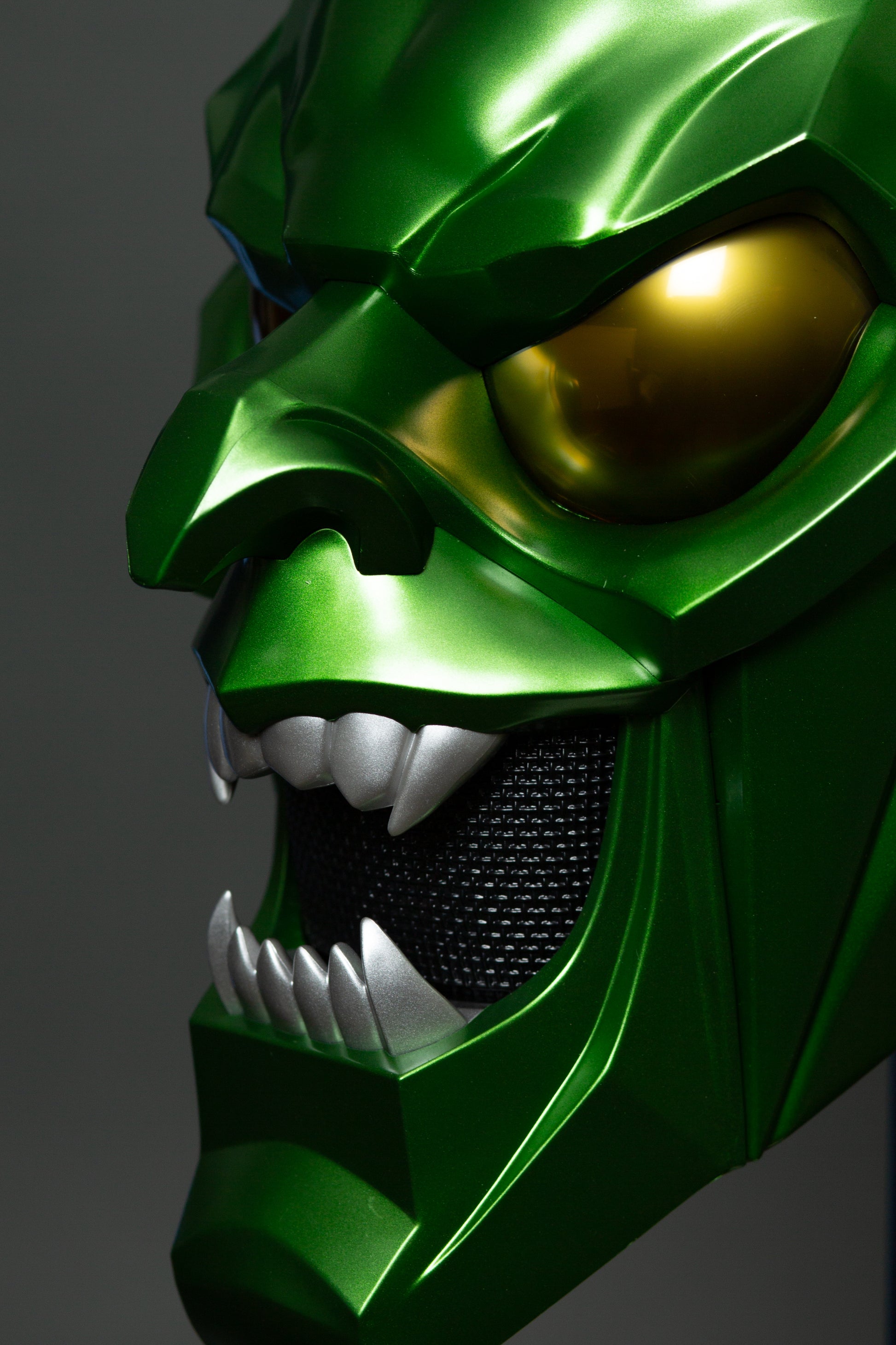 The Green Goblin Helmet is a replica designed to reflect the classic enemy's look from the Spider Man universe. It features a metallic green finish, sculpted lines, and sharp contouring around the face.