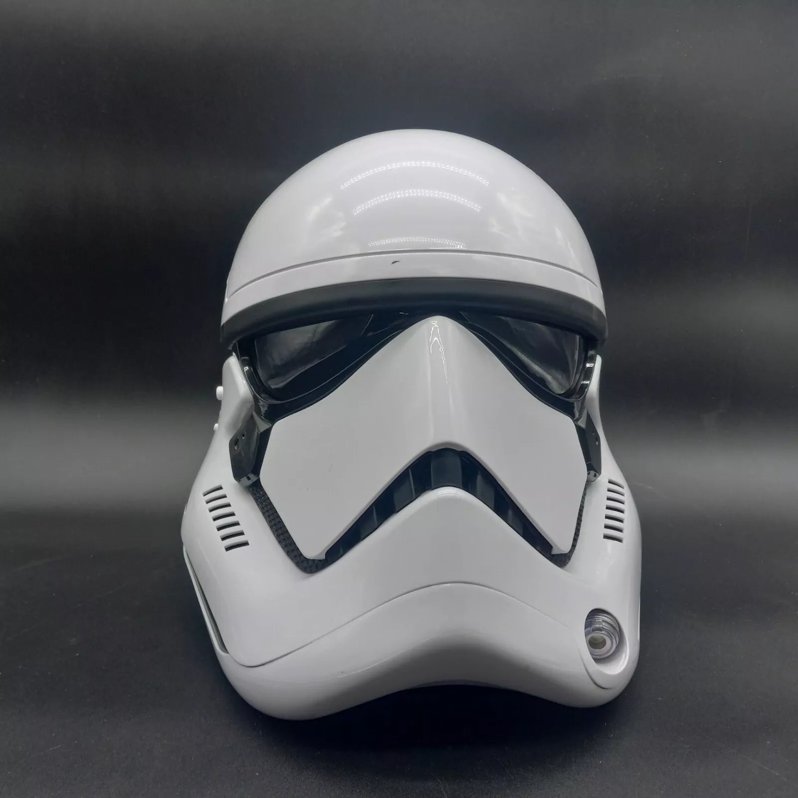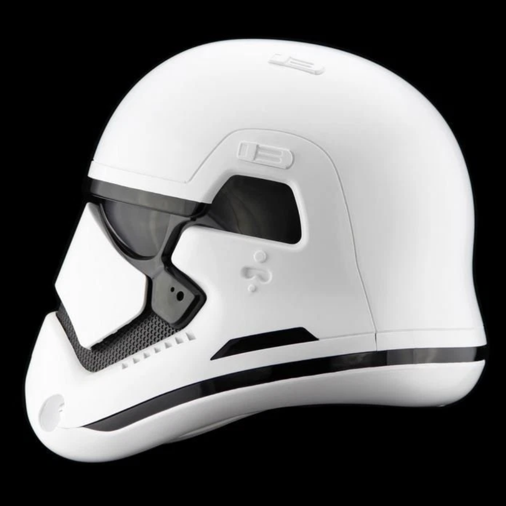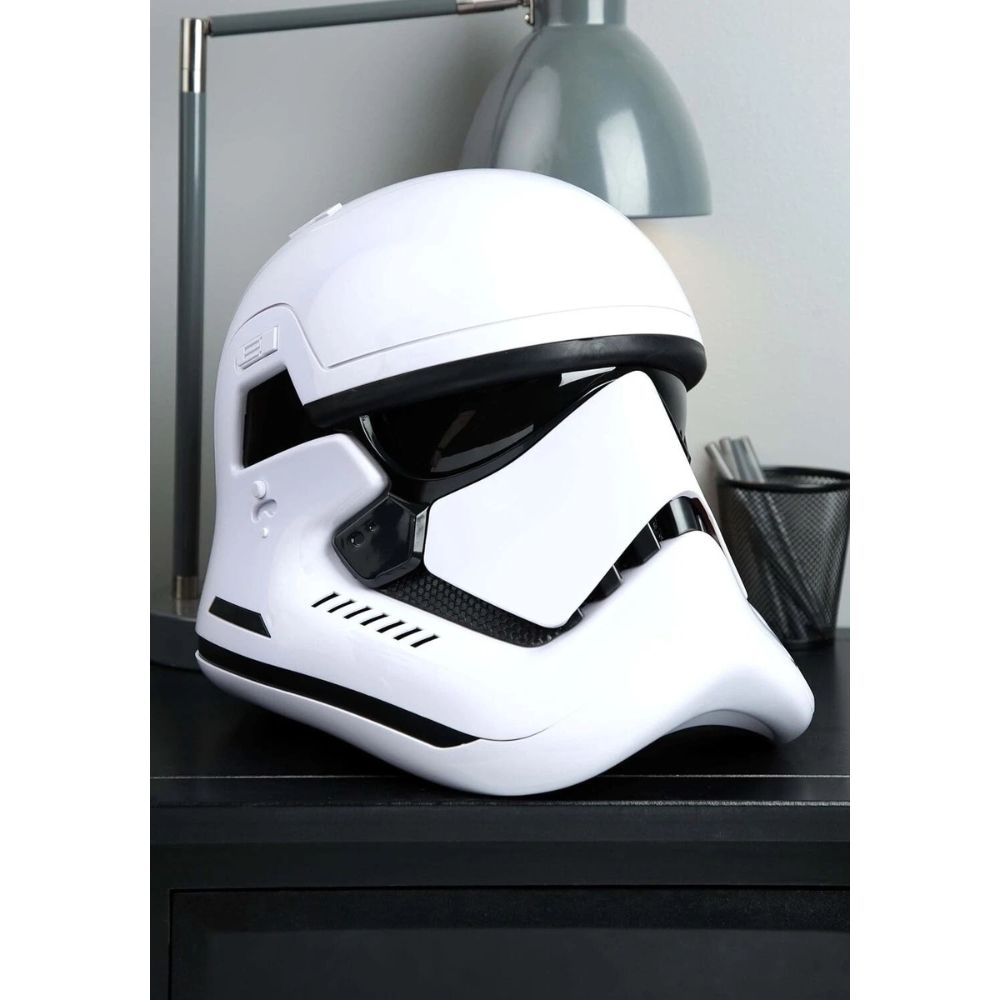 This helmet is equipped with a built-in voice modulation feature that electronically alters the user's voice to replicate the sound of a First Order Stormtrooper.
